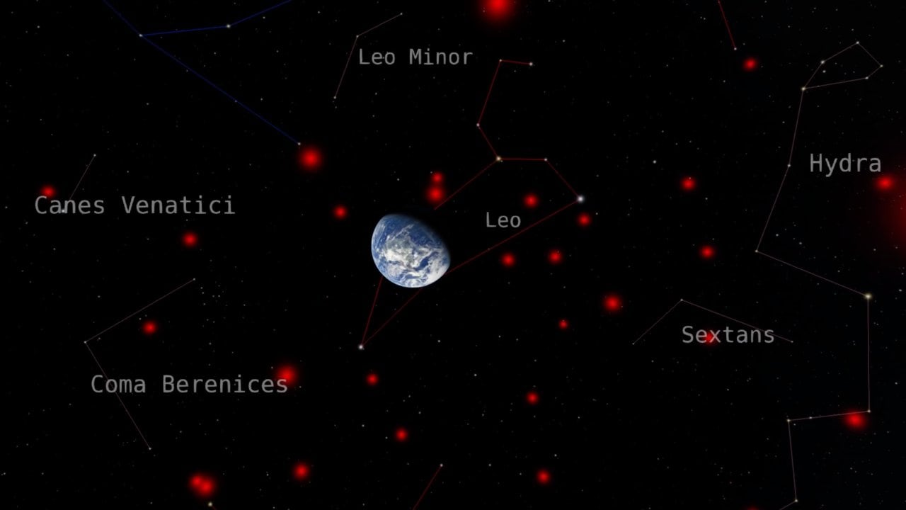 Tierra rodeada por las enanas marrones más cercanas, que se muestran en rojo, con el telón de fondo de las constelaciones circundantes. Créditos de imagen: NASA / Jacqueline Faherty / OpenSpace