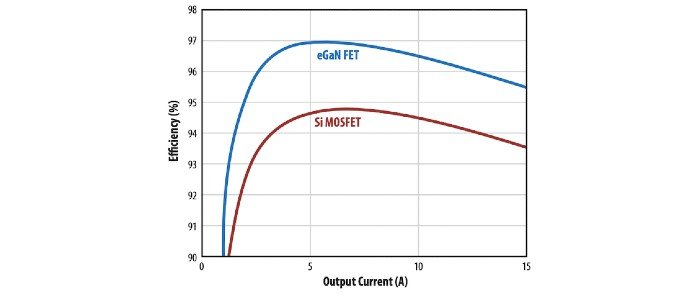 Comparación de un convertidor reductor de 48 V a 12 V con GaN en el diseño óptimo contra un MOSFET de 100 V Si. Imagen utilizada por cortesía de EPC