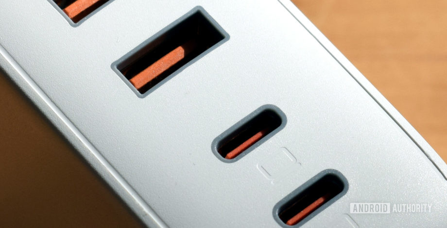 Crédito: Robert Triggs / Autoridad de AndroidCargador de PD de 4 puertos Aukey Omnia de 100 W: El cargador PD de 4 puertos Aukey Omnia de 100 W ofrece un total de cuatro puertos USB que se pueden usar todos a la vez. Dos USB-C y dos USB-A. Los puertos USB-C, ubicados en la parte inferior del enchufe, son compatibles con la especificación USB Power Delivery 3.0. Ambos puertos USB-C admiten dispositivos de 5V, 9V, 12V y 15V hasta 3A, así como carga de 20V hasta 5A. Eso cumple con las especificaciones necesarias para cargar incluso las computadoras portátiles más exigentes, como una Macbook Pro. Los dos puertos USB-A admiten el estándar de carga rápida de Apple 2.4A, pero nada más, lo que limita la mayoría de los dispositivos a aproximadamente 10W o menos. No hay soporte para Quick Charge, Samsung Adaptive Fast Charge u otros estándares patentados aquí.Como suele ser el caso de los adaptadores multipuerto, la velocidad de carga de cada puerto cambia dependiendo de qué otros puertos estén en uso. Esto puede resultar bastante confuso. Afortunadamente, Aukey tiene muy claro las capacidades de cada puerto. Esto está impreso en la parte inferior del enchufe de la siguiente manera: 1 puerto USB-C (Max 100W) 1 puerto USB-A: 5V 2.4A (Max 12W) USB-C + USB-C: 45W + 45W (Max 90W) USB -C + USB-A: 65W + 12W (Max 77W) USB-A + USB-A: 5V / 2.4A (Max 12W) USB-C + USB-C + USB-A: 45W + 45W + 12W Para una carga de 100W ladrillo, el Aukey Omnia 100W 4-Port es muy compacto, si no un poco pesado. Aun así, es más pequeño y portátil que muchos cargadores de portátiles USB-C de un solo puerto. Aukey afirma que es un 20% más pequeño que el cargador MacBook Pro de 16 pulgadas. La parte posterior del cargador alberga un enchufe de clavija plegable para mantenerlo compacto mientras viaja. En total, el cargador mide 69,8 x 69,3 x 33 mm (2,75 x 2,73 x 1,29 pulgadas) y pesa 223 g (7,87 oz). Está disponible en opciones de color blanco y negro.