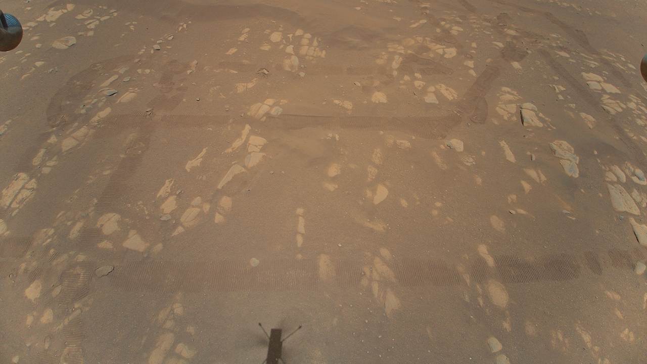 La NASA desglosó lo que podemos ver en la imagen. Si bien puede parecer poco notable al principio, una mirada de cerca mostrará las huellas del rover Perseverance. El 'Wright Brothers Field' está cerca de la sombra del helicóptero con el punto de despegue real justo debajo de la imagen. El helicóptero tiene cuatro patas y una parte de dos de sus pistas de aterrizaje se puede ver en la imagen (lados izquierdo y derecho de la imagen). También se puede ver una pequeña porción del horizonte en la parte superior (esquinas derecha e izquierda).