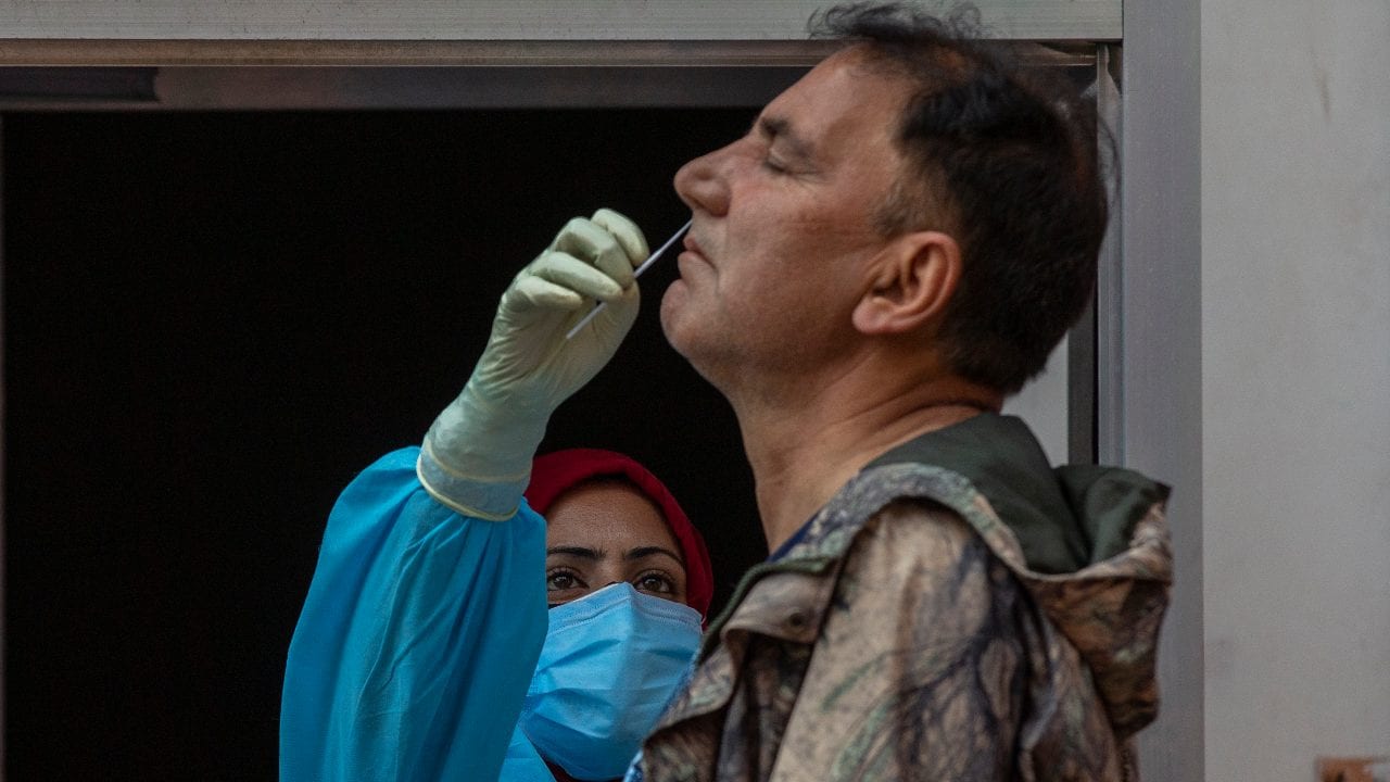 Un trabajador de la salud toma una muestra de un hisopo nasal de un hombre de Cachemira para realizar una prueba de COVID-19 en Srinagar, Cachemira controlada por India. Una caída en el número de casos de coronavirus en Mumbai ofrece un rayo de esperanza para India, que está sufriendo una oleada de infecciones. (Foto AP / Dar Yasin, archivo)