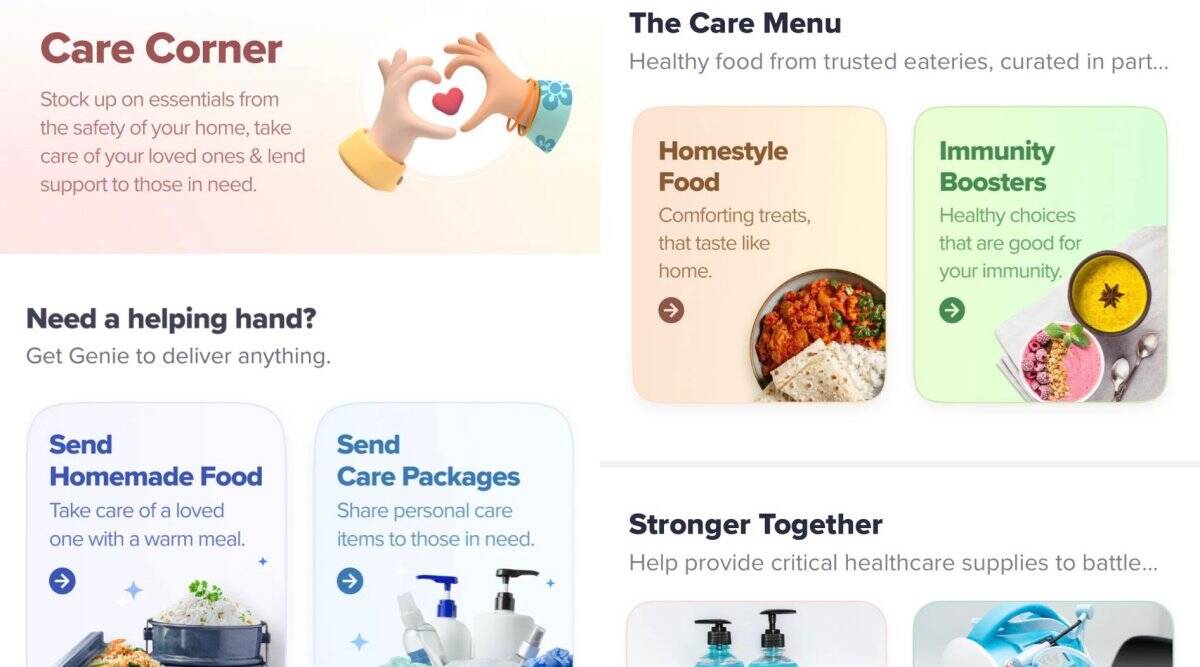 Swiggy ha agregado un Care Corner especial dentro de la aplicación para ayudar con los esfuerzos de COVID-19. Las características son similares a las que Swiggy Genie ya ofrece, excepto que esto parece estar dedicado a COVID-19. El Swiggy Care Corner muestra opciones para enviar comida casera, enviar paquetes de ayuda, recoger medicamentos y alimentos. Tenga en cuenta que estos ya estaban disponibles con Swiggy Genie.