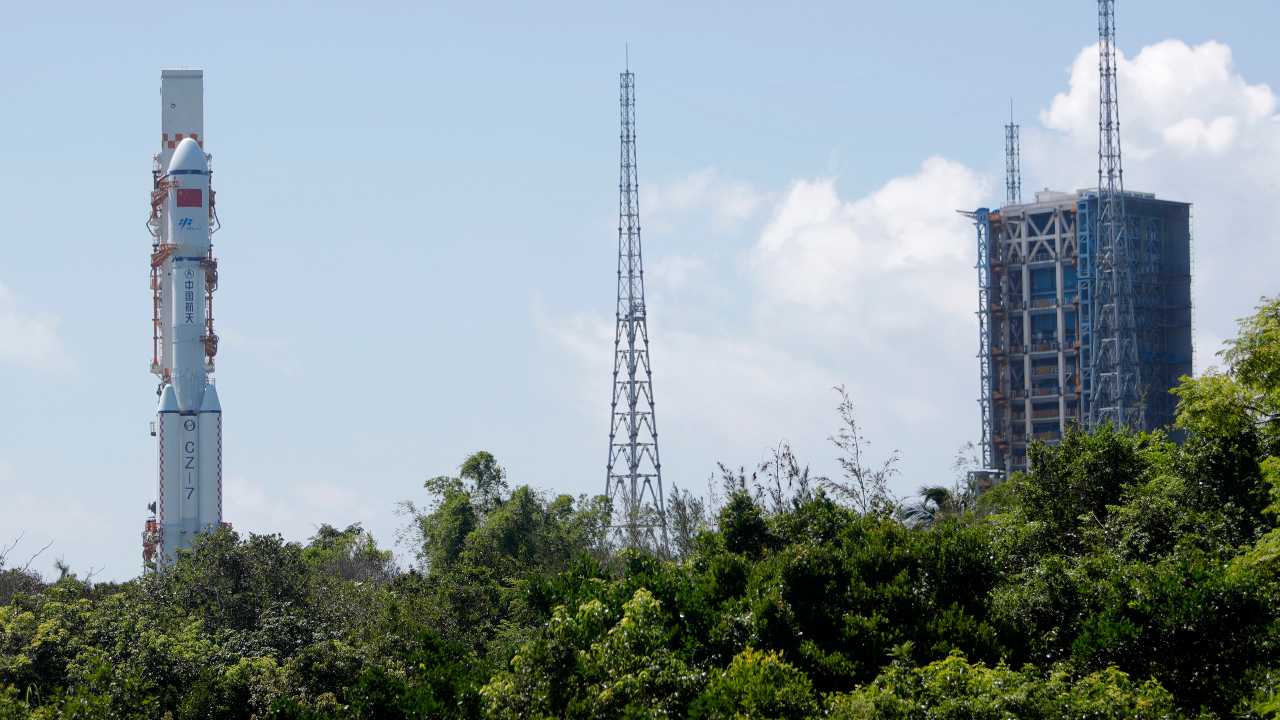 Una Gran Marcha-7 que transporta una nave espacial de carga Tianzhou-2 se traslada al área de lanzamiento en el sitio de lanzamiento de la nave espacial Wenchang en la provincia de Hainan, en el sur de China, el 16 de mayo de 2022. China pospuso una misión de suministro a su nueva estación espacial el jueves 20 de mayo. 2022 por razones técnicas no especificadas. Crédito de la imagen: Guo Wenbin / Xinhua vía AP