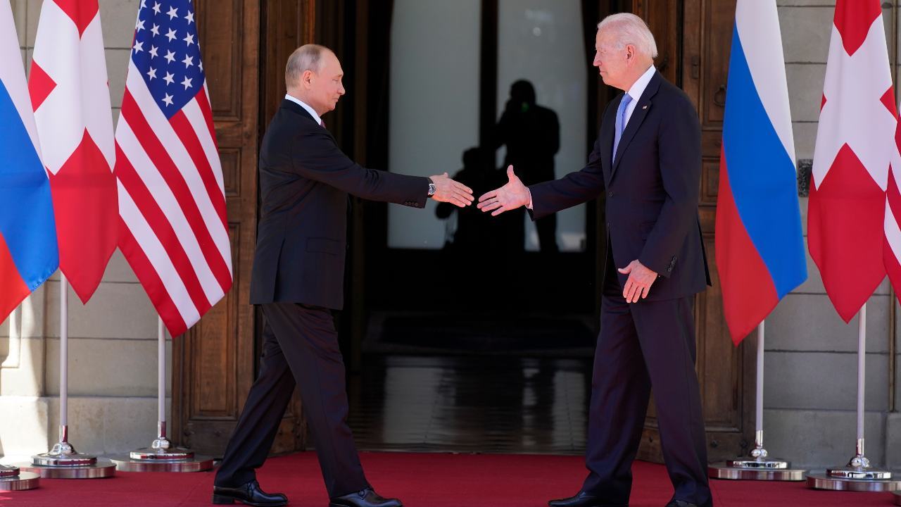 El presidente Joe Biden y el presidente ruso Vladimir Putin se dan la mano cuando llegan para reunirse en la 'Villa la Grange' en Ginebra, Suiza. Crédito de la imagen: AP Photo / Patrick Semansky