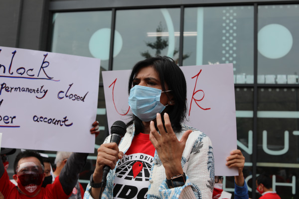 Los manifestantes se reunieron con camisetas de color rojo brillante y máscaras a juego con el logotipo del Gremio de Conductores Independientes. Carteles con lemas como "¡Congele la contratación, trabajadores reactivos ahora!" y "Unlock Uber" se estaban repartiendo en una mesa hacia la entrada. Lo que le faltó a la reunión en gran número, lo compensó con entusiasmo.