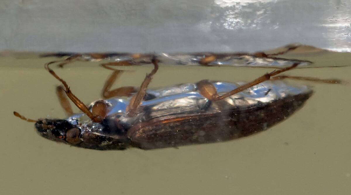 En agua dulce, algunos insectos llamados backswimmers nadan boca abajo, remando sus peludas patas traseras bajo el agua. Las larvas de la mosca acuática Dixidae, también llamadas mosquitos meniscos, utilizan las estructuras peludas de su abdomen para adherirse, boca abajo, a la superficie del agua. Pero estos escarabajos carroñeros acuáticos no nadan como el nadador o las larvas. Caminan, tal como uno podría imaginar que una especie de escarabajo terrestre camina sobre la tierra, o se desliza por su techo.