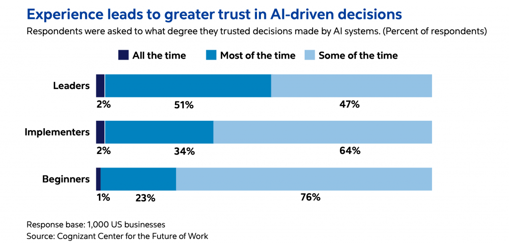 La investigación de Cognizant encuentra que la experiencia con la IA conduce a una mayor confianza en la capacidad de la tecnología para tomar decisiones competentes. Sin embargo, construir esta confianza llevará tiempo.