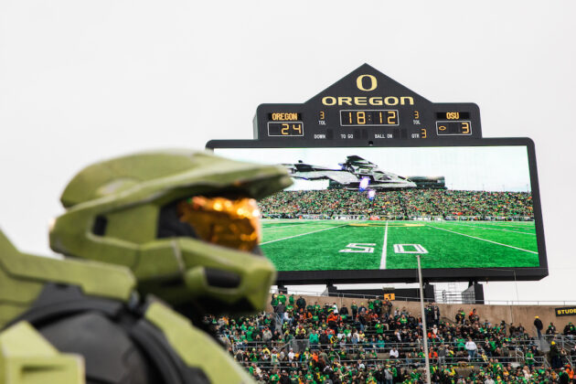 A projection of a vehicle used in Halo came swooping onto the field before dropping logos for Halo Infinite and the University of Oregon. The mixed reality tech was shown on the big screen at Autzen Stadium — at 12,276 square-feet, the largest in college football — and shared online.