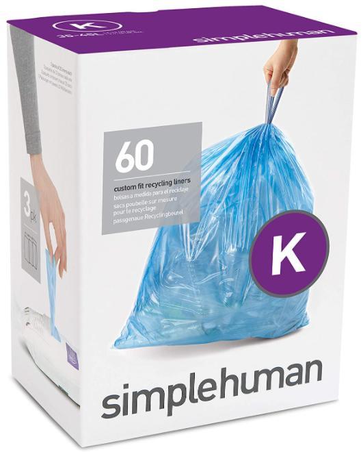 Si tiene muchos materiales reciclables circulando por su hogar, entonces tener una papelera de reciclaje dedicada puede ser una buena opción. Simplehuman tiene fantásticos revestimientos para latas construidos para contener todo lo que les arrojes. Nuestro favorito son las bolsas de reciclaje Code K con una capacidad de 9 a 12 galones, pero también puede obtenerlas en tamaños más grandes o más pequeños. Estas bolsas son súper confiables y pueden soportar fácilmente más de 30 libras sin ninguna posibilidad de roturas, rasgaduras o fugas. Son transparentes, por lo que siempre queda claro cuando las bolsas están llenas de artículos para la planta de reciclaje y no para un vertedero.