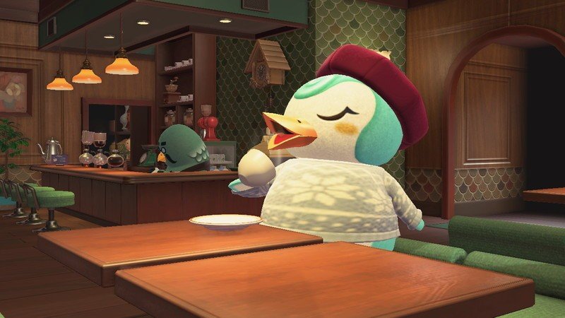 El café es servido por un personaje favorito que regresa, Brewster , un pidgeon con un aspecto formal. Puedes construir su café, The Roost, en tu museo e incluso te permite invitar a cualquier personaje que tenga una tarjeta amiibo, incluso personajes como Resetti y Digby que no están en New Horizons. A veces, traen consigo a un amigo.
