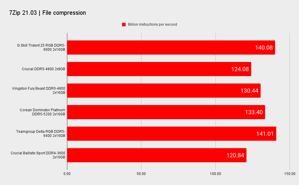 La compresión de archivos y los codificadores de video son buenas pruebas y aquí vemos que el kit G.Skill funciona bien. La prueba de codificación de video Handbrake muestra ganancias decentes a medida que aumenta el ancho de banda. El kit G.Skill con su baja latencia (para DDR5) casi empata el kit del equipo del estante superior. Tenga en cuenta que el kit G.Skill supera fácilmente al kit DDR4 en aplicaciones sensibles al ancho de banda.