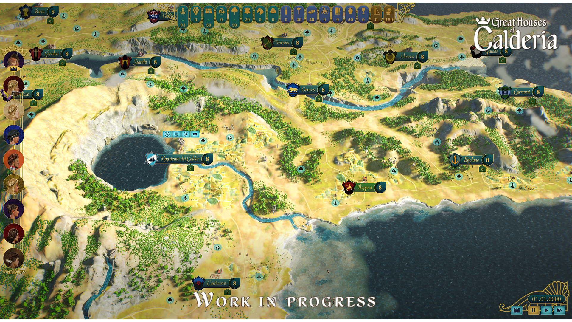 Calderia no es tan expansiva como Crusader Kings, y tiene lugar en una sola isla con alrededor de una docena de facciones en juego. También controlas directamente un único "feudo", donde podrás construir estructuras y producir varios recursos que se utilizan para alimentar y mantener la felicidad de tus sujetos, así como realizar acciones especiales. Pero esta escala más pequeña está en el quid del diseño de Calderia. Resistance Games quiere que conozcas íntimamente todo lo que sucede en la isla, en lugar de una pequeña parte.