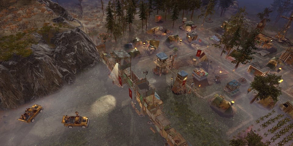 Es una pena que al principio los edificios sean tan indistinguibles visualmente. El problema con las tiendas de campaña y los cobertizos es que, a vista de pájaro, todos tienden a fusionarse en un desorden gris pardo. Esto generó problemas al principio del juego; tratar de encontrar un cobertizo de almacenamiento de alimentos entre todos los otros tipos de cobertizos requirió mucha búsqueda y clic. Este problema se desvanece de la memoria al final del juego, cuando algunos edificios bastante emocionantes son tuyos para la construcción.