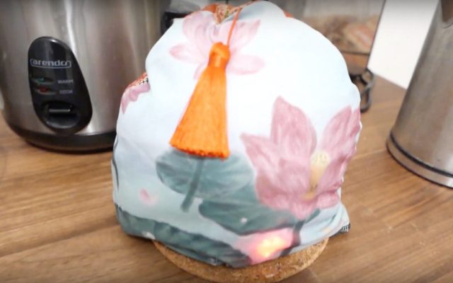 La física y diseñadora de moda tecnológica Kitty Yeung cosió y conectó este acogedor temporizador con sensor de temperatura para preparar té, codificando el nuevo micro:bit V2 en Make:Code.