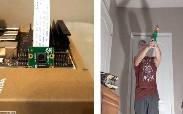 Cazadores de demonios: Juega a Doom a tamaño real, proyectado en la pared, con tu cuerpo como controlador, entrenando a Xavier con una cámara CSI (una Pi Cam V2.1) para detectar tus gestos de correr, saltar, siguiente arma, disparar, agacharse y más.