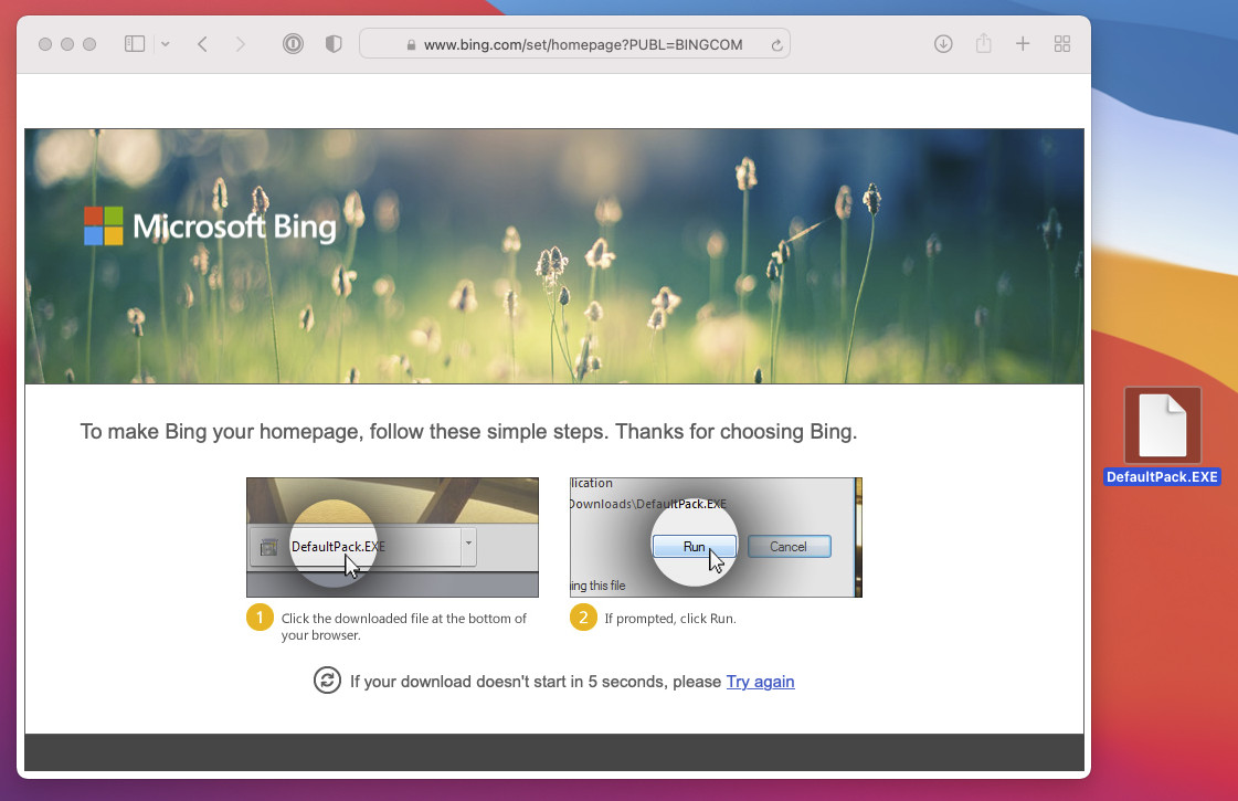 Por alguna razón, esta acción descargó un DefaultPack.EXE ejecutable en mi Mac que no funciona, lo cual es confuso. Tal vez debería buscar en Google qué hacer con el archivo.