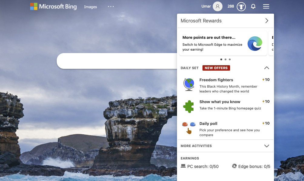 No soy Nilay, pero después de leer todas tus razones, he decidido darle una oportunidad a Bing. Fui al sitio e inicié sesión con mi cuenta de Microsoft, lo que me informó que había acumulado 288 puntos, tal vez de mi compra de la Serie X en Microsoft Store el año pasado. Microsoft no estaba convencido de que fuera lo suficientemente serio todavía, por lo que también me informó que usar el navegador web Microsoft Edge “maximizará sus ganancias”. No tenía ganas de cambiar de navegador web en este momento, pero solo descargar Edge parecía ser suficiente para ganar otros cinco puntos; ¡Gracias, Microsoft!
