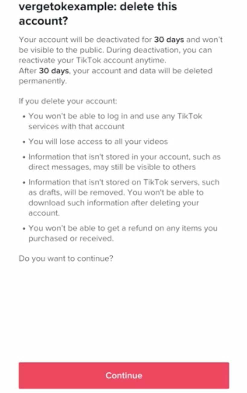Puede recuperar su cuenta hasta 30 días después de eliminarla. Se le mostrará una pantalla que le indicará que tendrá 30 días para reactivar su cuenta si cambia de opinión y le describirá todas las cosas a las que perderá el acceso después de eliminar su cuenta (lo que incluye el acceso a los videos que ha publicado). ). Tocar “Continuar” lo llevará a una pantalla de verificación de cuenta. TikTok te enviará un código que debes ingresar si tienes una cuenta estándar o te pedirá que inicies sesión con el servicio que usaste para crear tu cuenta (como Apple, Google, etc.). Después de verificar, toque el botón “Eliminar cuenta” y confirme su decisión por última vez para marcar su cuenta para su eliminación. La aplicación se actualizará y volverá a la pantalla de inicio de sesión.
