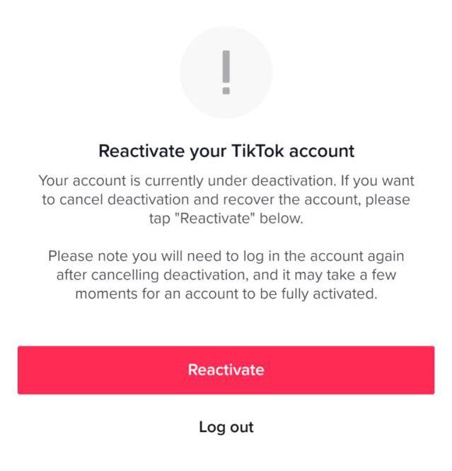 Como TikTok menciona cuando elimina su cuenta, puede detener el proceso volviendo a iniciar sesión dentro de los 30 días. Si lo hace, recibirá un mensaje que indica que su cuenta tiene una desactivación pendiente. Tocar el botón “Reactivar” le permitirá volver a ingresar y cancelar el proceso de eliminación, mientras que tocar el botón “Cerrar sesión” permitirá que continúe el proceso de eliminación.