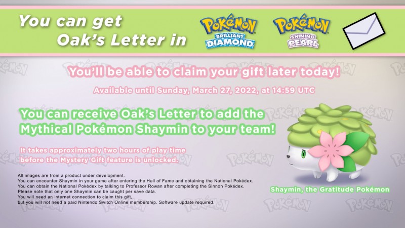 Más tarde hoy, se lanzará un nuevo evento misterioso para Pokémon Brilliant Diamond y Shining Pearl y les dará a los jugadores la Carta de Oak. Esto se puede usar para comenzar el encuentro del Pokémon mítico Shaymin en el juego, dando a los jugadores la oportunidad de agregar este Pokémon a su grupo y Pokédex. Como señaló Game Freak, se necesitan aproximadamente dos horas de tiempo de juego antes de que se desbloquee la función Mystery Gift en las nuevas partidas de estos remakes. Tienes desde ahora hasta el 27 de marzo para reclamar el regalo misterioso de Shaymin.
