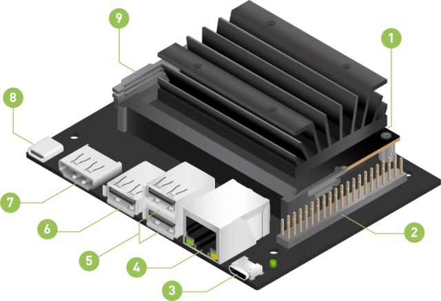Kit de desarrollador de Nvidia Jetson La mayoría de los fabricantes se conectarán primero con uno de los kits de desarrollador de Nvidia, que consta del módulo Jetson y una placa portadora que desglosa todas sus funciones en puertos y pines de fácil acceso. Hay docenas de placas portadoras de terceros si está buscando interfaces más específicas.