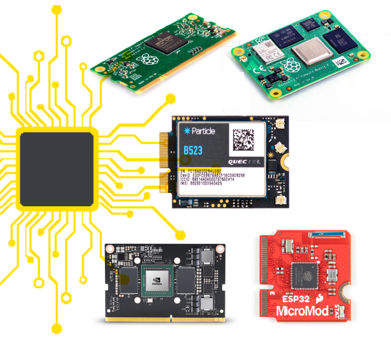 ¿Puede el factor de forma del producto admitir placas apiladas a través de pines y encabezados GPIO, o debe permanecer plano y requiere conectores de borde o cables de cinta? Echemos un vistazo a algunas ofertas de sistema en módulo (SoM) que han logrado el éxito en el mercado: Raspberry Pi Compute Module, Sparkfun MicroMod, Particle SoM y la serie Nvidia Jetson. Existen muchas otras opciones, pero estas placas representan a los principales proveedores y ofrecen diferentes enfoques para la integración de productos.