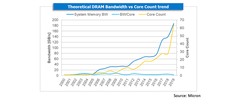 Sin embargo, el ancho de banda de la memoria por núcleo ha sido un cuello de botella para las soluciones de cómputo más rápidas y, por lo tanto, la solución típica será agregar más RAM dinámica (DRAM) para adaptarse a la necesidad de cómputo.