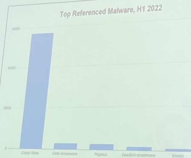 Un tipo de malware común que Recorded Future ha visto un “aumento real” en el uso en los últimos años son los ladrones de información. Esta información robada luego se vende en la dark web. Wilmington destaca que los ladrones de información toman una huella digital de su navegador y luego se tomará cualquier cosa que se haga en esa ventana, y las personas pueden comprar eso en línea. “Puedo decir: ‘Si compro esta credencial por $20, ¿a qué me da acceso? ¿Y viene con una cookie de sesión también para que pueda saltar?’”, explica Wilmington. Según Wilmington, Raccoon Stealer fue uno de los ladrones de información más populares este año. Sin embargo, “hizo una pausa” en marzo de 2022. Los actores de amenazas luego cambiaron de Raccoon a Mars Stealer, MetaStealer, BlackGuard, RedLine y Vidar. A fines del primer semestre de 2022, Raccoon Stealer 2.0 surgió y volvió a ganar popularidad. Wilmington continúa mostrando un gráfico del malware de mayor referencia utilizado en ataques cibernéticos durante el primer semestre de 2022. Cobalt Strike toma la delantera por un amplio margen: