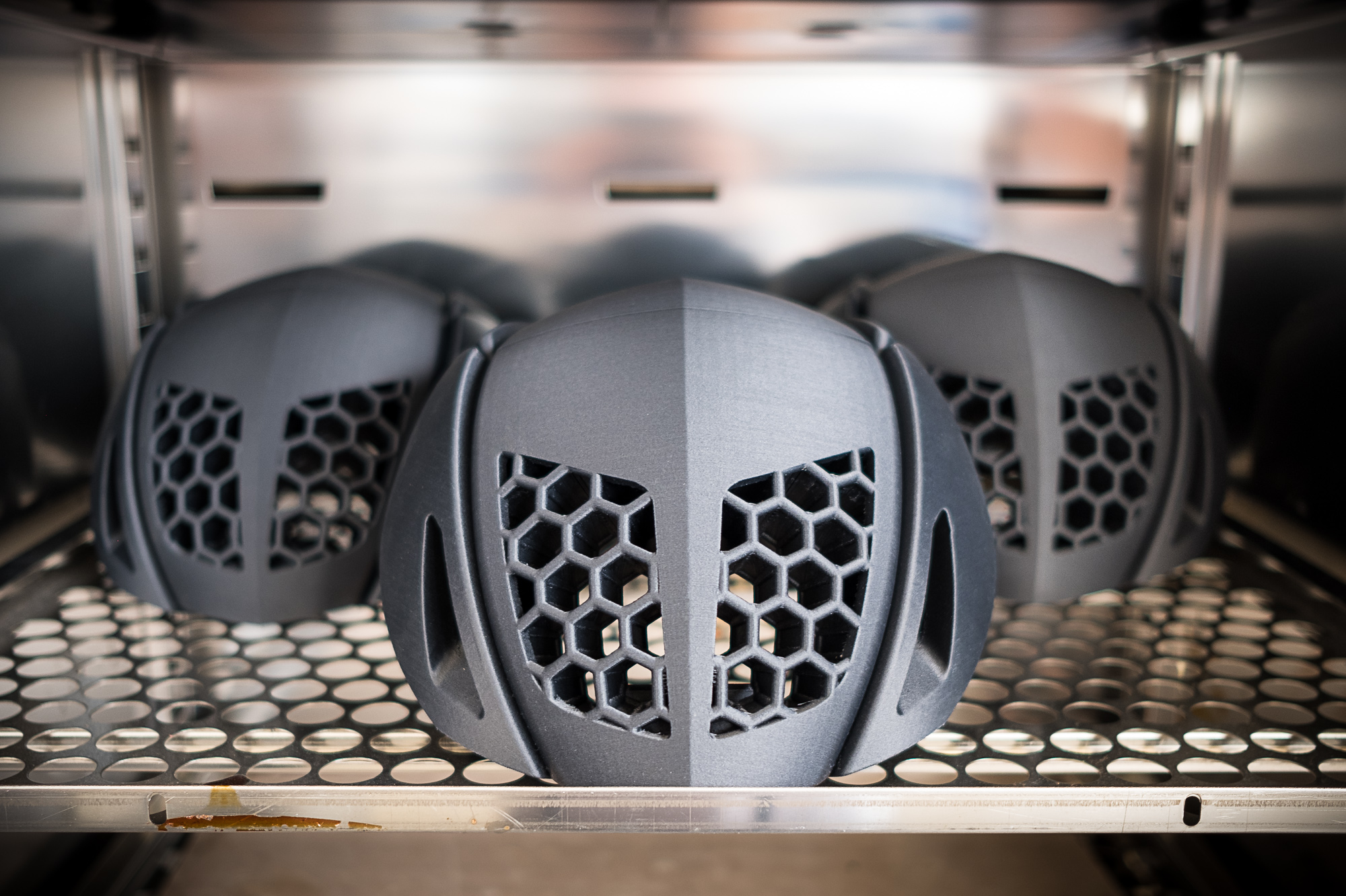 Cascos nuevos, consigan sus cascos, recién salidos del ov… Quiero decir, impresora 3D. Credito de imagen: Kav. Antes de abrir la fábrica actual, Kwok me dijo que la compañía estaba creando cascos de prueba de concepto en “un garaje glorificado”, pero el nuevo laboratorio cuenta con una pila de nueva tecnología y materiales hechos a la medida para imprimir cascos. “Estamos en nuestra quinta generación de impresoras”, dijo Kwok, que son impresoras Prusa muy modificadas. “Actualizamos todo el hardware nuevo, reescribimos todo el software y creamos controles ambientales en la parte superior de todo el clúster. Utilizamos un compuesto de nailon de fibra de carbono patentado formulado para la atenuación de impactos y la estabilidad en temperaturas que van desde -15C a 70C. Tomó 27 iteraciones, pero no hay nada igual en el mercado”.