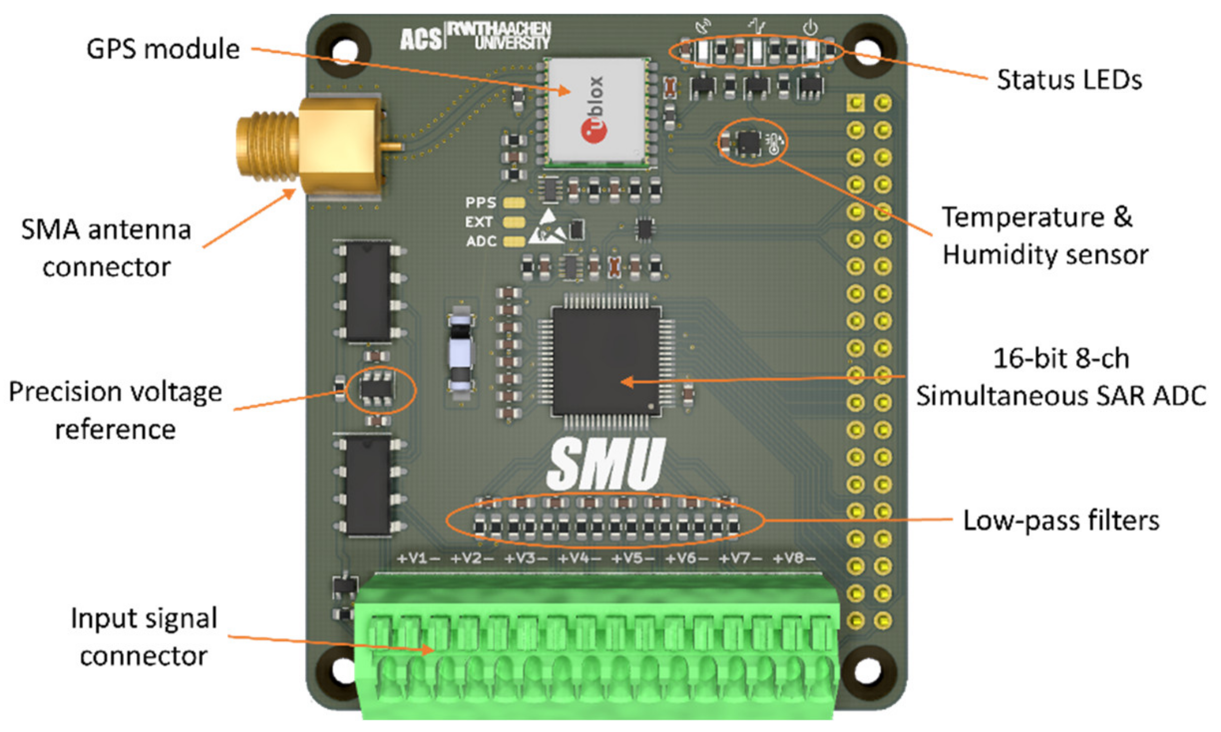Un equipo del Instituto para la Automatización de Sistemas de Energía Complejos (ACS) de la Universidad RWTH de Aquisgrán ha estado trabajando durante un tiempo en el análisis de sistemas de energía ampliamente distribuidos. En un intento por alejarse de las plataformas electrónicas altamente especializadas (y costosas), han producido algunos instrumentos diseñados para operar con la plataforma Raspberry Pi y una pila de software de código abierto. Llaman a la plataforma la SMU (Unidad de Medida Sincronizada). La SMU consta de un HAT colocado en un RPi3, dentro de una caja impresa en 3D que está diseñada para conectarse a un riel DIN. Después de todo, se supone que esto es una plataforma industrial. En cuanto al hardware, la estrella del espectáculo es Texas Instruments. ADS8588S que es un ADC de muestreo simultáneo de 8 canales y 16 bits. Este es un dispositivo bastante bueno, con un rendimiento de 200 kSPS y un front-end programable por canal, empaquetado en un QFP de 64 pines apto para piratas informáticos. Sin embargo, lo que hace que este proyecto sea interesante es cómo resolvieron el problema de controlar la adquisición y sincronización de datos muestreados.