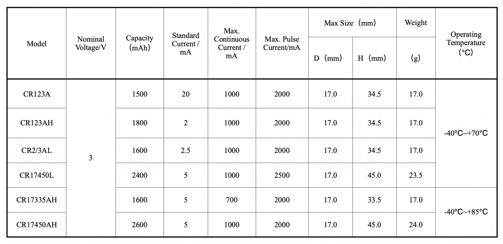 - Alta capacidad y capacidad de descarga de pulsos de corriente (CR123AH)