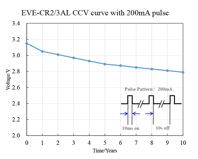 La batería EVE-CR123AH tiene la capacidad de descarga continua más de 2000 veces de pulso de 900 mA a 20 ℃.