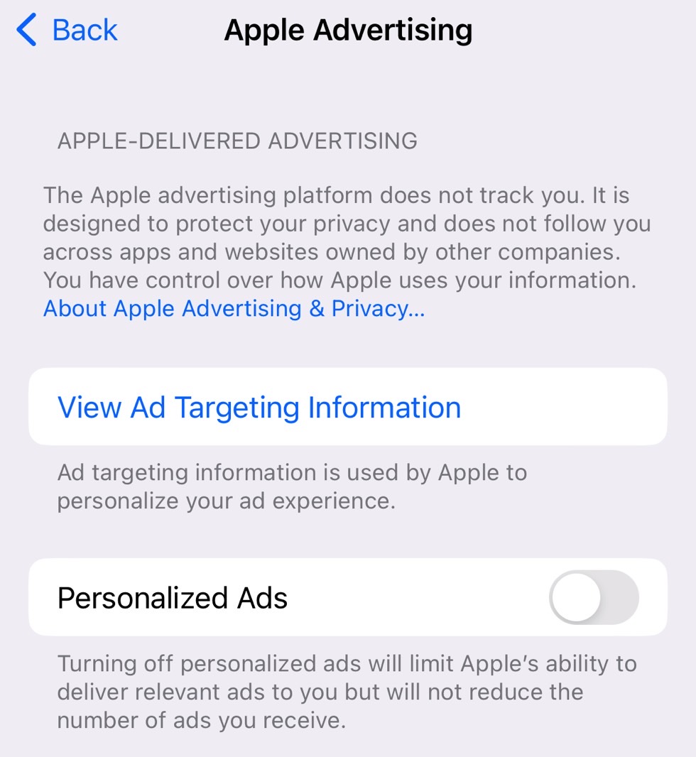 Cómo deshabilitar anuncios personalizados en iPhone. Fuente de la imagen: Chris Smith, BGR Como puede ver en la captura de pantalla anterior, Apple advierte que la cantidad de anuncios no cambiará: