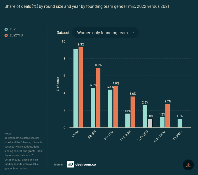 ¿Por qué la caída? Curiosamente, los encuestados dijeron que si bien la economía, específicamente las tasas de interés más altas y el riesgo de inflación, fueron los mayores factores de enfriamiento que impactaron en la industria tecnológica de Europa, dijeron que el segundo factor más importante fue un entorno regulatorio hostil. El desempeño de las empresas del mercado público y el sentimiento del público en general en torno a la tecnología y la situación geopolítica, respectivamente, completaron el tercer y cuarto lugar. De hecho, algunas de las otras grandes conclusiones de Atomico confirman lo que muchos de nosotros hemos estado viendo. Los mercados de OPI, señala Atomico, están totalmente cerrados. Solo hubo tres OPI este año en la región, en comparación con las sorprendentes 86 del año anterior, una caída del 30%. Y la cantidad de “unicornios” que se producen, es decir, empresas que alcanzan una valoración de más de mil millones de dólares, también se redujo. Hubo 31 de estas este año, frente a 105 en 2021. Pero nuevamente, al igual que con la financiación, esto parece indicar que el año pasado fue un caso atípico: 2020 tuvo 25 y 2019 tuvo 35 compañías con $ 1 mil millones o valoraciones más altas. Del mismo modo, descubrió que las rondas de financiación en sí se redujeron en tamaño a medida que avanzaba el año. Una vez más, al igual que con el financiamiento general, la primera mitad del año batió récords, con 133 rondas de financiamiento de capital de $100 millones o más (sin incluir rondas de deuda o secundarias), que fue más que 2019 y 2020 combinados. Sin embargo, pueden haber sido fundadores que buscaban hacer heno mientras el sol aún brillaba: en la segunda mitad del año, ese total se redujo a “simplemente” 37 rondas de ese tamaño. Los inversionistas de EE. UU. también se están moviendo menos hacia la región: su participación se redujo en un 22 % en 2021. En particular, no son solo aquellos en el extremo del espectro de crecimiento los que sienten el pellizco: “82 % de los fundadores que respondieron a la encuesta creen ahora es más difícil recaudar capital de riesgo que hace 12 meses”, señala el informe. Y en tiempos más difíciles, el impulso por la diversidad se ha pasado por alto aún más que antes. Atomico señaló que el 87% de todos los fondos de capital de riesgo en Europa “todavía son recaudados por equipos fundadores solo para hombres”. Por el contrario, la proporción de fondos recaudados por equipos exclusivamente femeninos se ha reducido del 3 % al 1 % desde 2018, ya que la cantidad de acuerdos se ha mantenido en un 5-6 %, pero el dinero que se destina a ellos no ha aumentado. “Incluso cuando los equipos solo de mujeres suben con éxito una ronda, es probable que reciban menos, y este patrón tiende en la dirección equivocada”, señala Atomico, y puede ver a continuación qué tan mal están representadas las mujeres en el extremo superior de la financiación. espectro en términos reales, aunque crecieron ligeramente en algunos tramos: