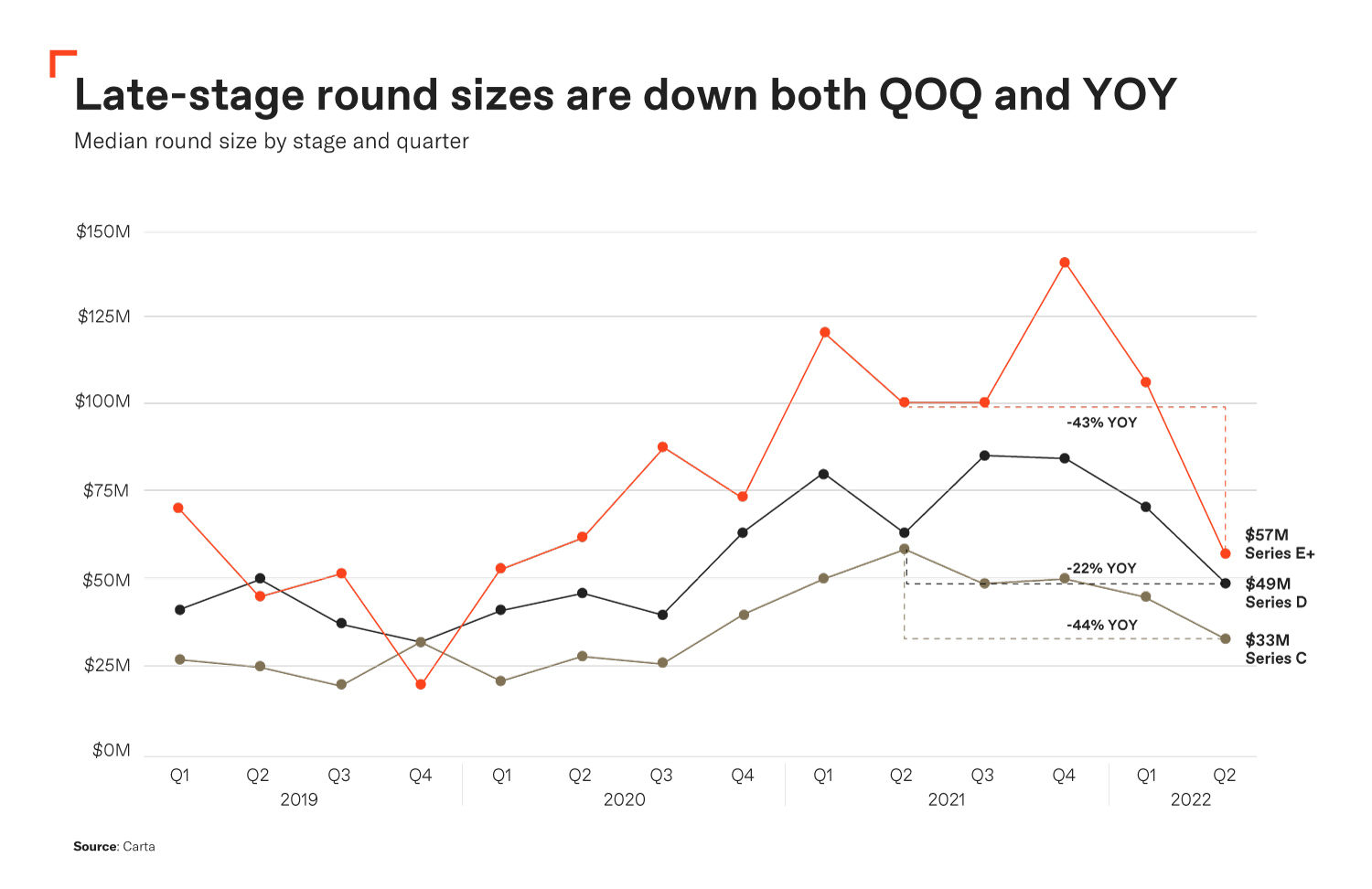 Carta informa que los niveles de recaudación de fondos privados han disminuido en los EE. UU. desde un 2021 récord. Como era de esperar, las empresas en etapa avanzada han sufrido la peor parte de este golpe. Actualmente, los expertos del mercado alientan a los líderes a no poner sus esperanzas en el polvo seco del capital de riesgo, a pesar de que hay mucho. Como lo indica el gráfico a continuación, el tamaño de las rondas de financiamiento de última etapa se ha reducido.