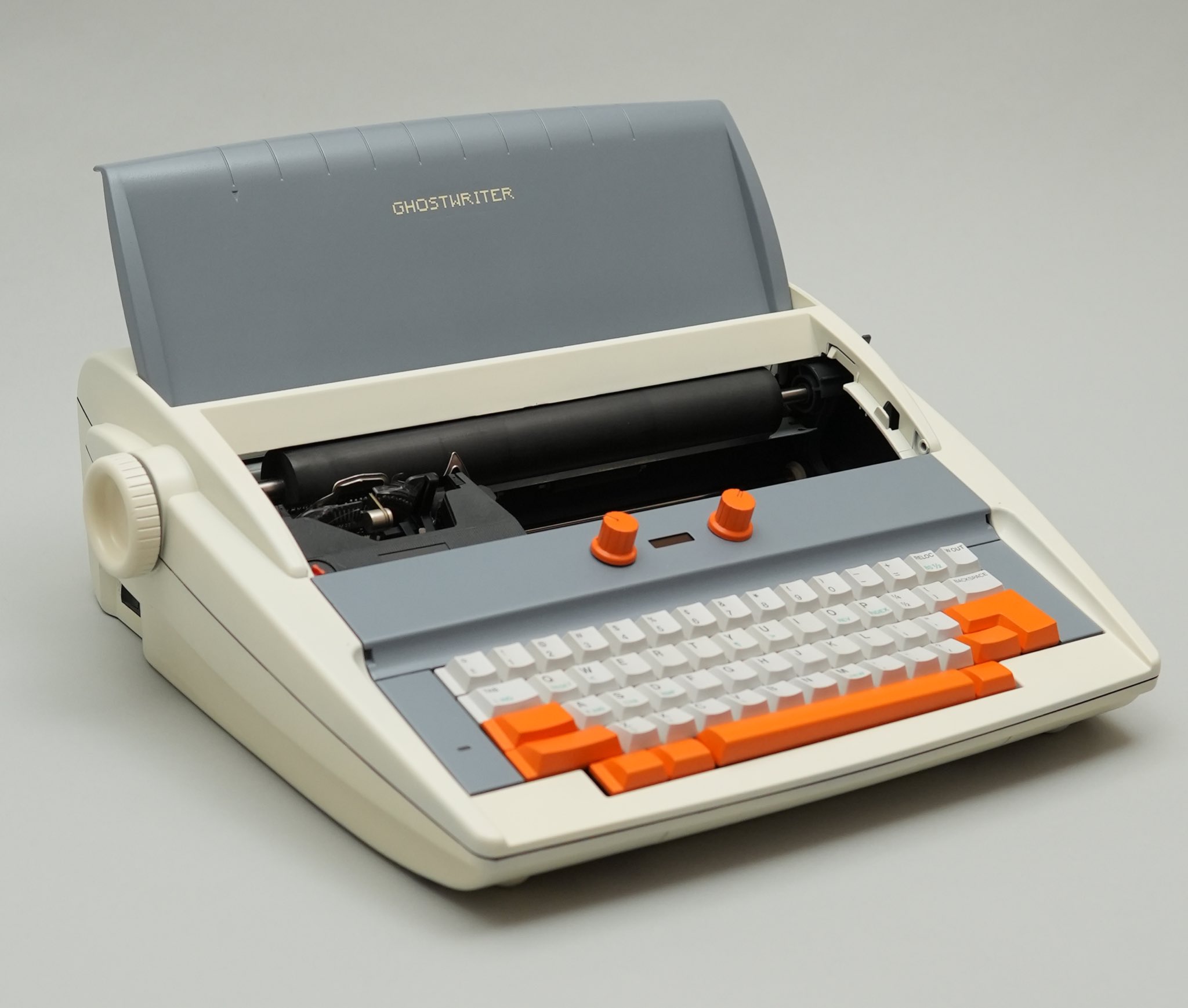 Por supuesto, el aspecto de esa vieja máquina de escribir no funcionaría. The Ghostwriter necesitaba algunas imágenes llamativas, lo que Arvind hizo con toneladas de lijado y pintura.