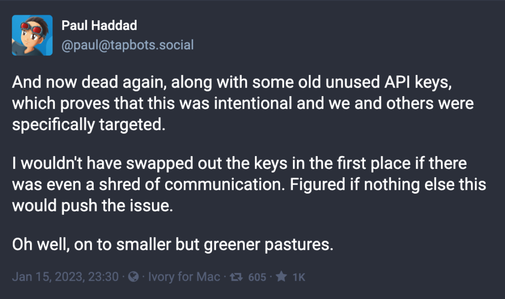 Una de las primeras decisiones de Musk fue despedir a muchos de los empleados que mantenían en funcionamiento las API de Twitter. “La mierda comenzará a romperse”, dijo un empleado actual a The Verge. A juzgar por el estado incluso de los servicios propios de Twitter, la advertencia del empleado anónimo parece hacerse realidad. Para las aplicaciones populares de terceros, ahora parece que fueron atacadas intencionalmente: